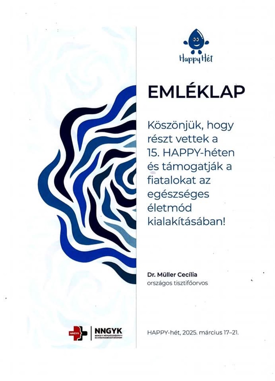 Nagy örömünkre tagintézményünk emléklapot kapott a Happy-hétben való aktív részvételéért, amelyet büszkén helyeztünk el tagintézményünk falán. A program nemcsak élményekkel, de értékes ismeretekkel is gazdagította gyermekeinket.