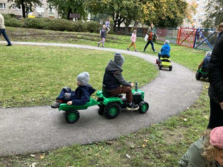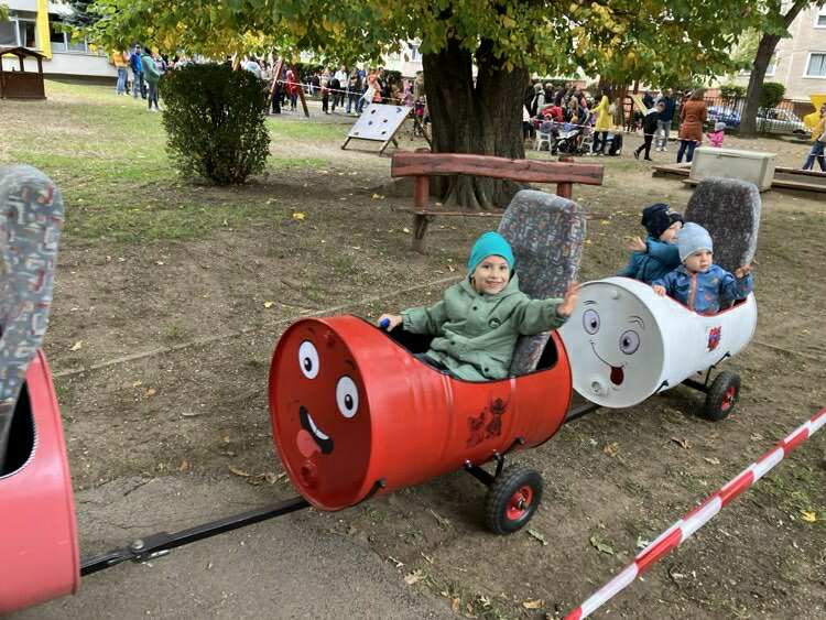 Szüreti mulatságunkat zenével és táncházzal indítottuk. Idén is Sinka Tímea néptánc-pedagógus segítségével, ez megalapozta a jó hangulatot és közben alaposan fel is melegedtünk a hűvös reggelen! Majd a táncos bemelegítés után minden kisgyerek elindult arra a helyszínre, mely leginkább vonzotta őt! Idén újdonság volt a gyerekeknek a hordó- vonat, mellyel még addig egyik gyerek sem találkozott. A vonat útvonalát úgy tűztük ki előzetesen, hogy minél hosszabb pályát tudjon bejárni az ovi udvaron. Talán mondhatom, hogy idén a vonat volt a legnépszerűbb a gyerekek körében, sokan 2x-3x is felszálltak rá! A kézműves asztaloknál több technikával ismerkedhettek a gyerekek: csutka- babát készítettek, szőlőt nyomatoltak, asztali mécsest ragasztottak. Mozgásos népi játékokon mindenki kipróbálhatta ügyességét, a teknőknél pedig a kukoricamorzsolást gyakorolhatták a gyerekek. A szüreti helyszínen szőlőt szemeztek, daráltak, préseltek, majd a végén megkóstolhatták a mustot is! A máskor biciklis pályaként használt területre pedig egy nagy traktor érkezett, amire minden kisgyerek felülhetett a nap folyamán. Körülötte pedig több kis traktorral szállíthatták a gyerekek két helyszín között a tököt, almát, kukoricát, illetve a kisebbek talicskázhattak is. A kis traktorok a nap folyamán egyszer sem álltak le, voltak gyerekek, akik vissza-visszatértek, őket a finom paprikás krumpli illata sem vonzotta el innen! A gyerekek a nap folyamán a szülők által sütött almás, répás, tökös süteményeket és a frissen sütött fánkot is megkóstolhatták! Alapítványunk támogatásával meleg ebéddel vártuk a családokat délben, melyet már szép napos időben fogyaszthattak el! A napot mesével zártuk, egy anyukánk, Csiki- Demjén Anetta mesélt három gyönyörű kis mesét a boldog, de már fáradt gyerekeknek, akik a szalmabálákon ülve hallgatták.
