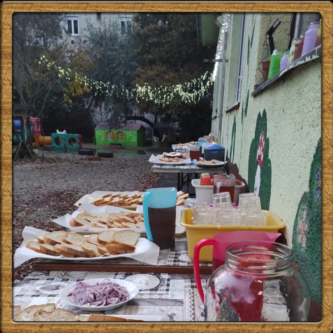 A hangulatosan kivilágított udvaron libazsíros, lilahagymás uzsonnát és forró teát fogyaszthattak a vendégek.