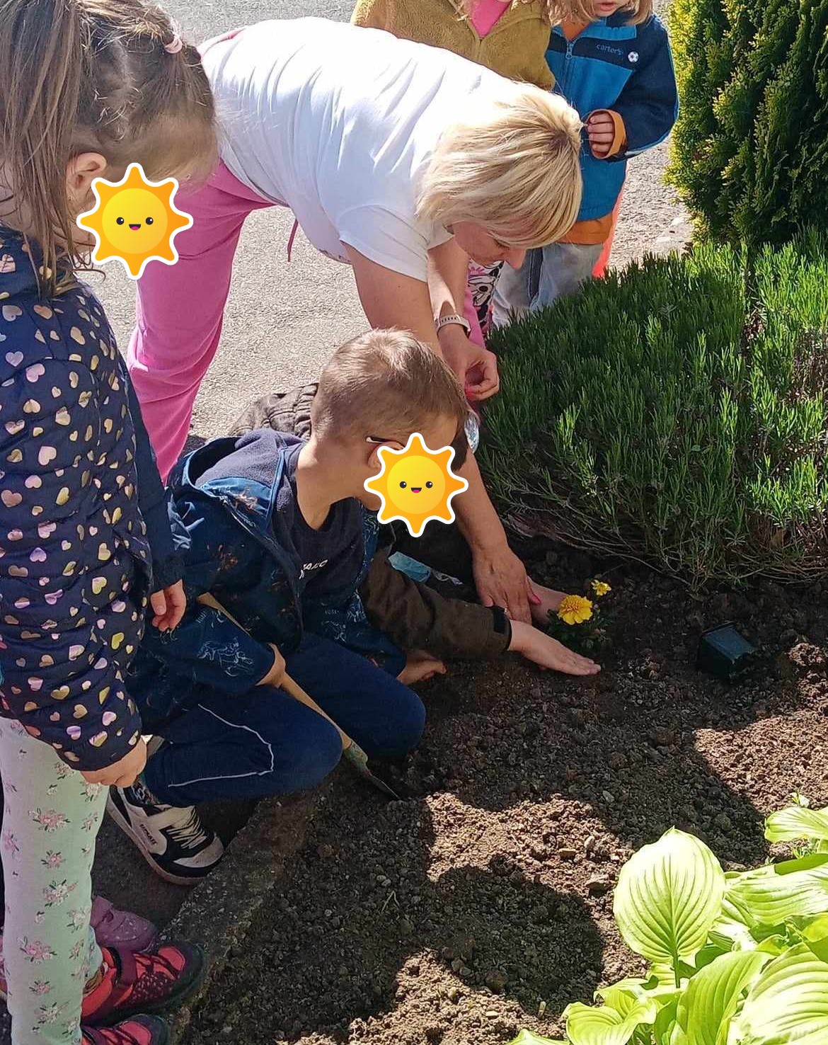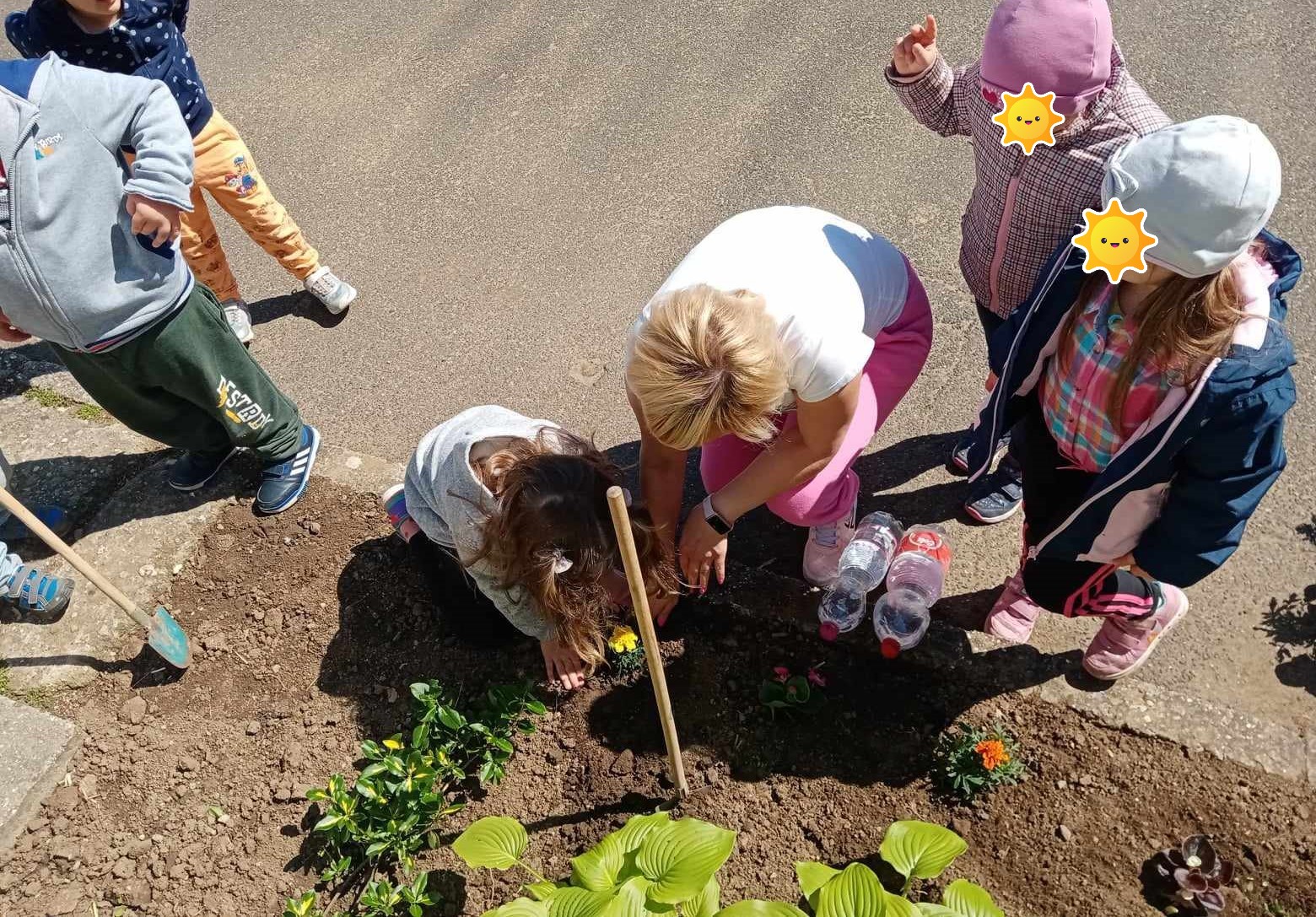A gyermekekkel virágpalántákat ültettünk az óvoda előkertjében és a virágos kertben, ezzel is ösztönözve őket a zöld területek megóvására, a növények gondozására. A kerti munka közben megismerkedtünk a kerti szerszámokkal: gereblye, ásó, a gyermekek gyakorolhatták azok használatát.