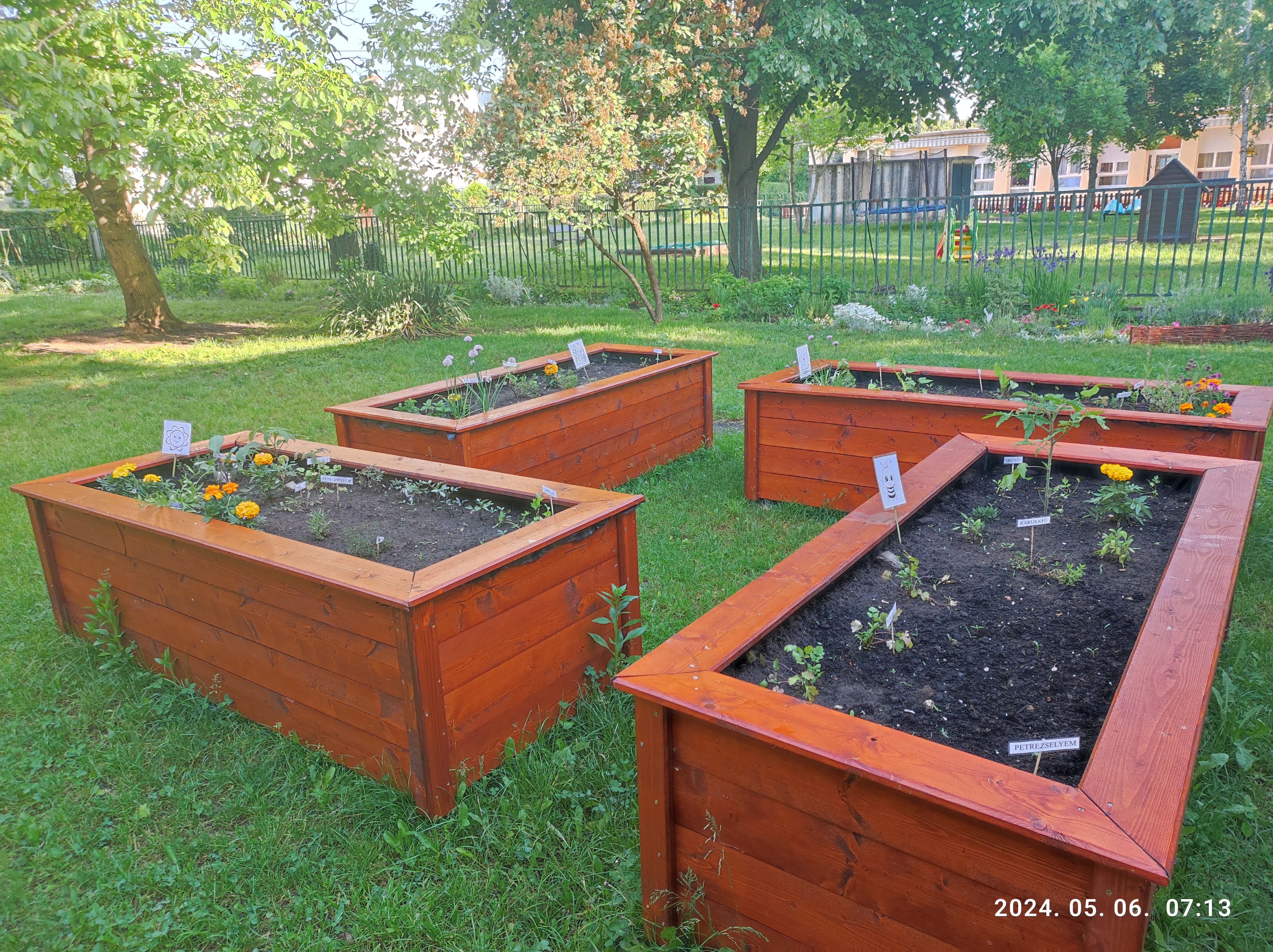 Programunk a külső világ tevékeny megismerésére épül és a komplexitásra törekszik, mely során az ismereteket összefüggéseiben, kölcsönhatásaiban mutatjuk be a gyermekeknek úgy, ahogy a valóságban is előfordul. Ennek gyakorlatban való megvalósításához óvodai közösségünk az elmúlt nevelési év során határozta el, hogy belső udvarunkon egy mini tankertet hozzunk létre. A tervünk megvalósítását a gyerekekkel és családjaikkal közösen kezdtük el a múlt évben (Föld napja), melyet hagyományként szeretnénk tovább folytatni. Ez éven 4 darab magas ágyást kaptunk az önkormányzati képviselőtől, így minden csoport létrehozhatta a maga fűszer és gyógynövény kertjét a gyerekek és családjaik közreműködésével. A mini tankert hátsó részébe komposztáló edényt helyeztünk el, melyben az óvodába keletkező zöldhulladékot komposztálva kertünk talaját igyekszünk javítani. Kiskertünk kialakításának elsődleges célja a gyönyörködtetésen, pihenésen, a madarak, rovarok, növények megfigyelésén túl, egy a természetet csodáló és tisztelő magatartás átadása a gyerekeknek.