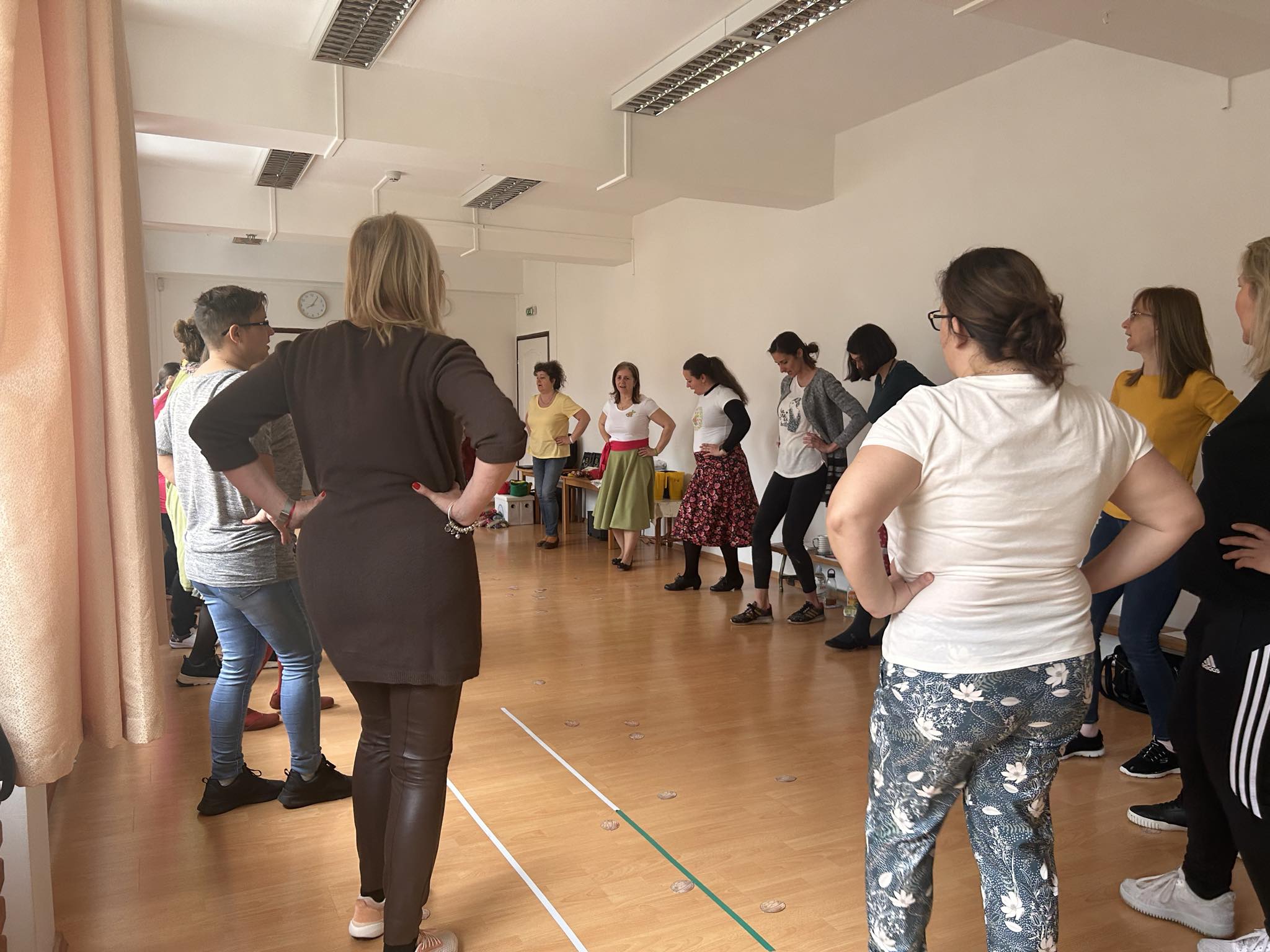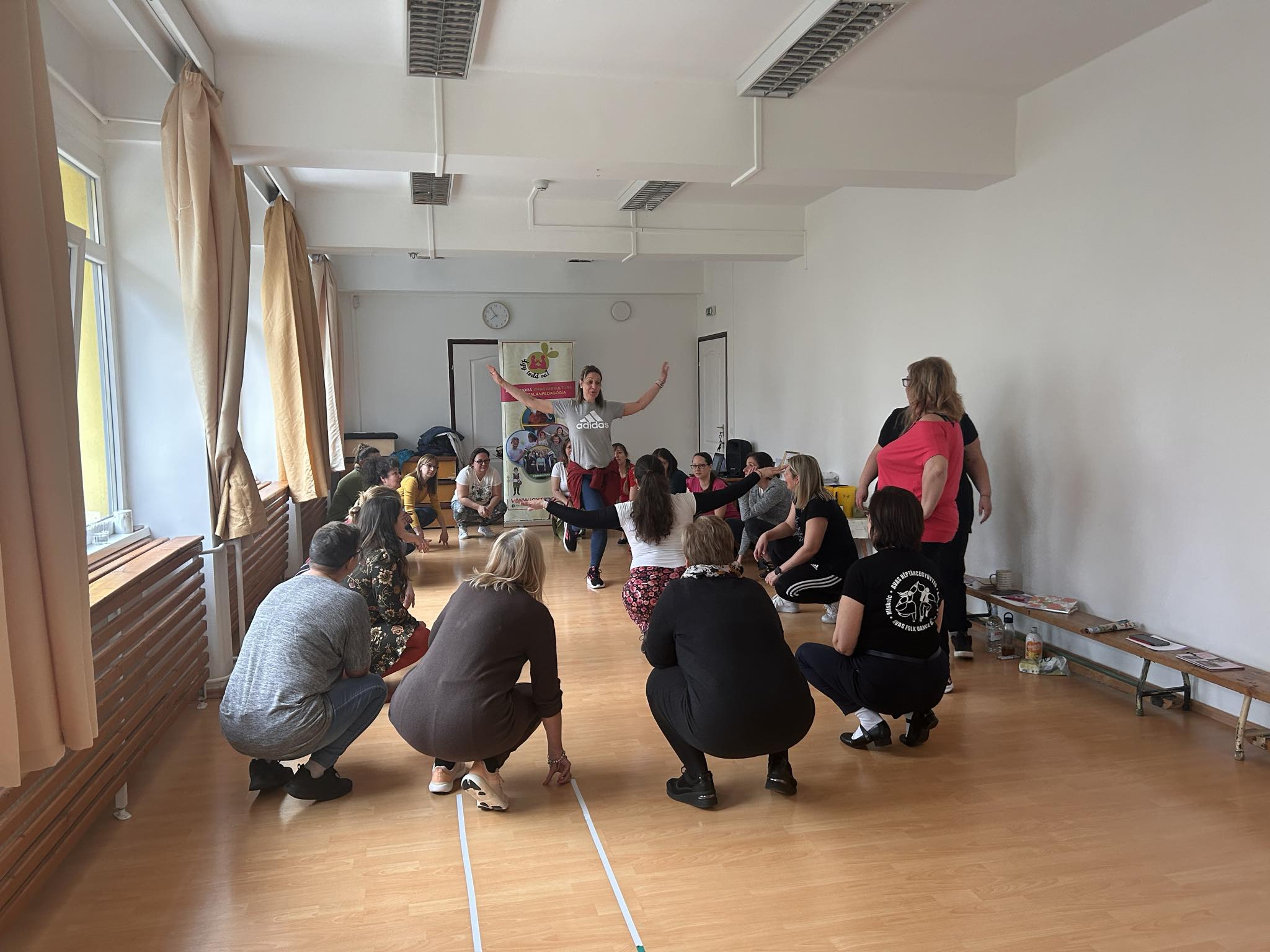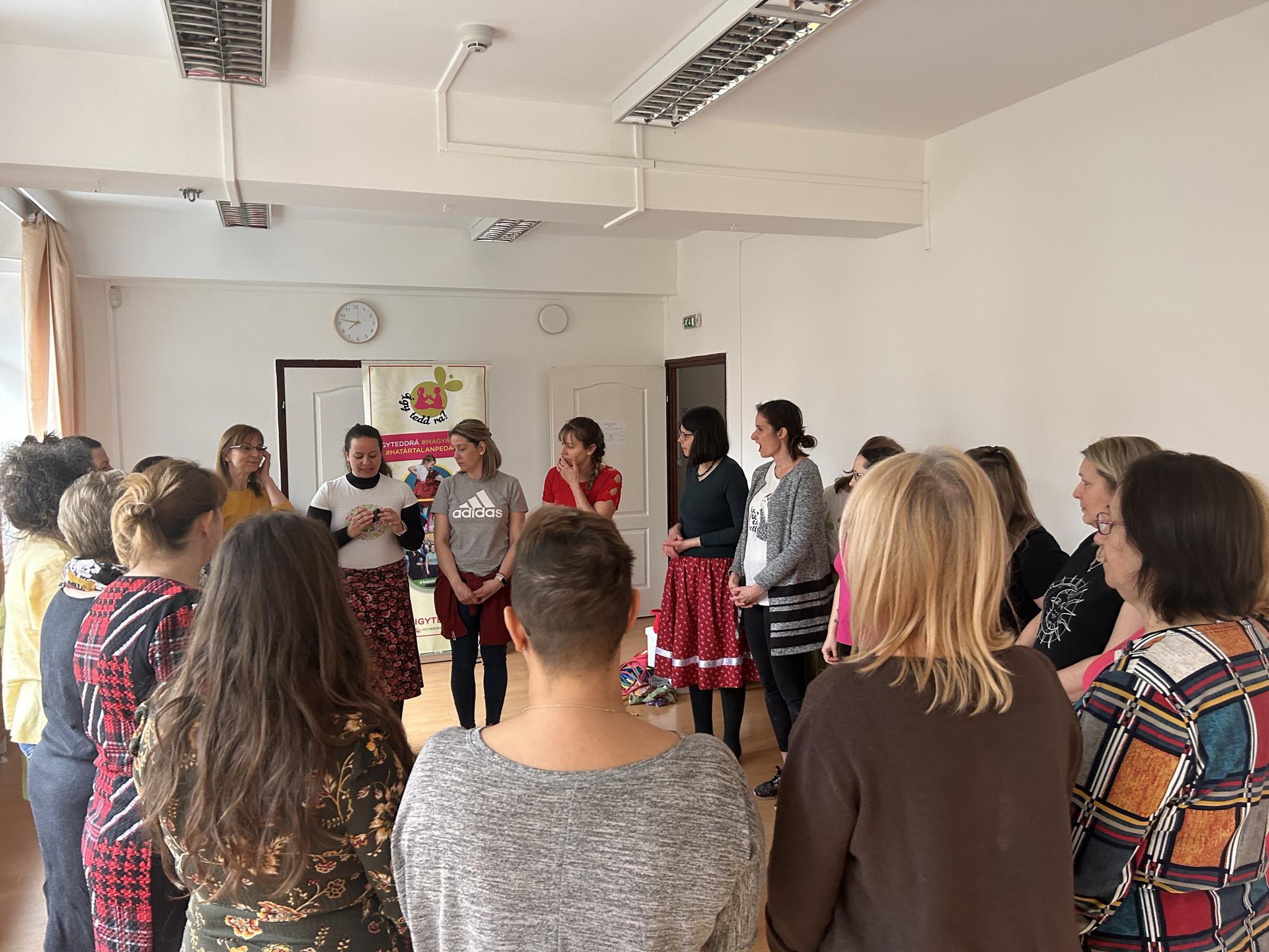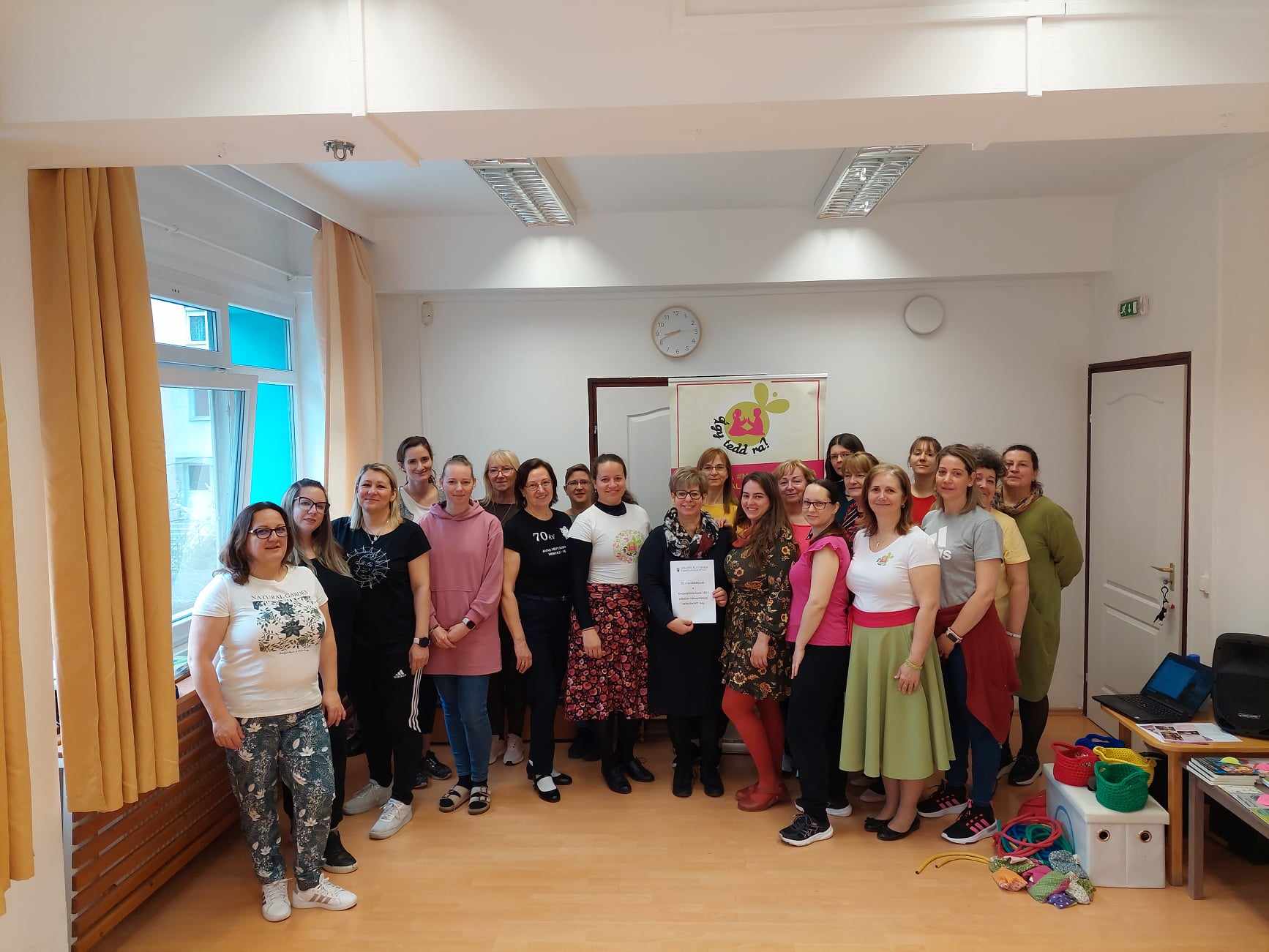 Március 18.- án a MIÓVI Bársony János Úti Tagóvodájában óvodapedagógusaink részt vehettek egy 8 órás “Népi játék, néptánc módszertan” Így tedd rá! képzésen. A képzés egy mesterterv megvalósításaként, a Kincses Kultúróvoda 2023 pályázat támogatásával valósulhatott meg. A képzés Bárdos Zsuzsanna néptánc oktató vezetésével, nagyon jó hangulatban zajlott! Megismerkedtünk az Így tedd rá! Néptánc tanítás módszertanával, eszközeivel, a gazdag népi játékok anyagával. Játszottunk, táncoltunk, énekeltünk egész nap, közben elsajátítottunk olyan népi játékokat, játékfűzéseket, melyeket napi munkánk során csoportjainkban is jól használhatunk. A jeles napokhoz kötődően - jelen esetben a Húsvét és Virágvasárnap -, megismertük a ma már elfeledett népszokásokat, hagyományokat, melyeket átadhatunk az óvodás gyermekeknek és szüleiknek! Mivel óvodánk néphagyományőrző értékeket képvisel, így a képzés és az azon elhangzott ismeretek mindnyájunk számára jól beépíthető lesz tervezésünk és hagyományőrző tevékenységeink során. A napot jó hangulatú, közös fényképezés zárta. Mindnyájan sajnáltuk, hogy vége lett a képzésnek, szívesen folytattuk volna!