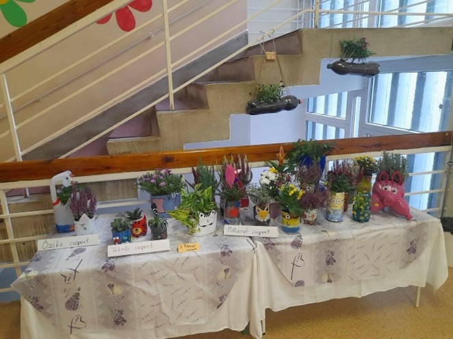 Óvodánk egyik fő feladata a fenntarthatóság, a környezettudatosság. Felhívást tettünk közzé a szülők felé, hogy az otthon, a háztartásban található kiürült flakonokból gyermekeikkel közösen készítsenek virágtartókat, kaspókat. Az óvoda aulájában és bejáratánál kiállítást rendeztünk a festett, ragasztott fantáziadús alkotásokból. A visszajelzések alapján mindez ötleteket adott, inspirálta a szülőket arra, hogy otthonukban is újrahasznosítsák a kiürült műanyag flakonokat. A virágokat felhasználtuk óvodánk külső, belső szépítéséhez, gazdagításához