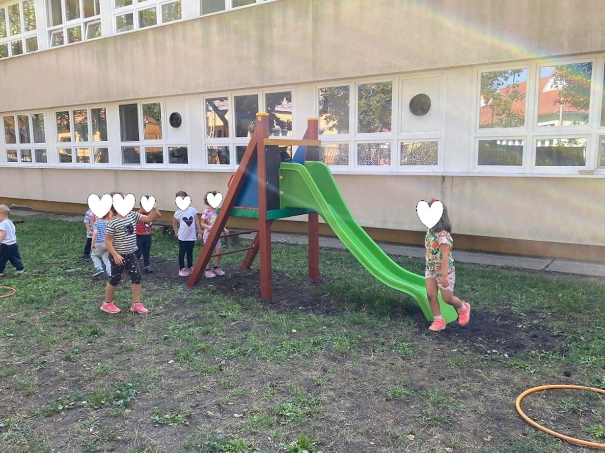 Az óvoda udvarára sikerült egy kicsiknek és nagyoknak egyaránt ideális biztonságos kerti csúszdát, és egy kültéri házikót vásárolni. Az esztétikus és praktikus játékeszközök a gyermekek önfeledt játéka közben észrevétlenül is fejlesztik motoros készségeiket és a személyiségfejlődésükhöz szükséges egyéb képességeiket. Az új játékeszközök azonnal a gyermekek kedvencévé váltak, boldogan játszanak egymással.