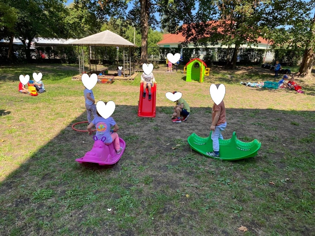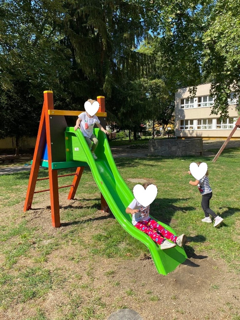 A támogatás összegéből sikerült új, korszerű és biztonságos udvari beépített kültéri színes gyermek csúszdát, mobil műanyag házikókat, billenő hintákat és homokozó eszközöket vásárolnunk.