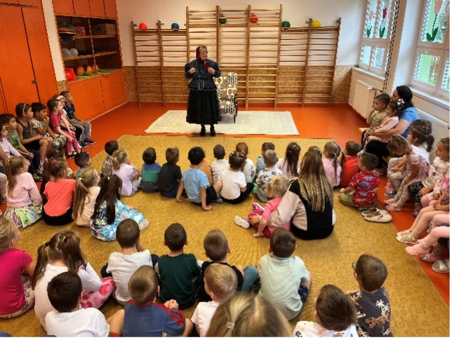Szeptember 30.-án a Magyar Népmese Napja alkalmából érkezett hozzánk, Kovács Lászlóné Edit néni, aki a délelőtt folyamán mesélt a gyermekeknek, majd ezt követően közös éneklésre és táncra invitálta a gyermekeket, felnőtteket egyaránt. Bemutatta, hogyan is mesél egy igazi mesemondó, a maga ízes és varázslatos egyéniségével. A gyermekek figyelemmel, érdeklődve, aktívan vettek részt a programban. Jó hangulatban, vidáman telet a délelőtt.