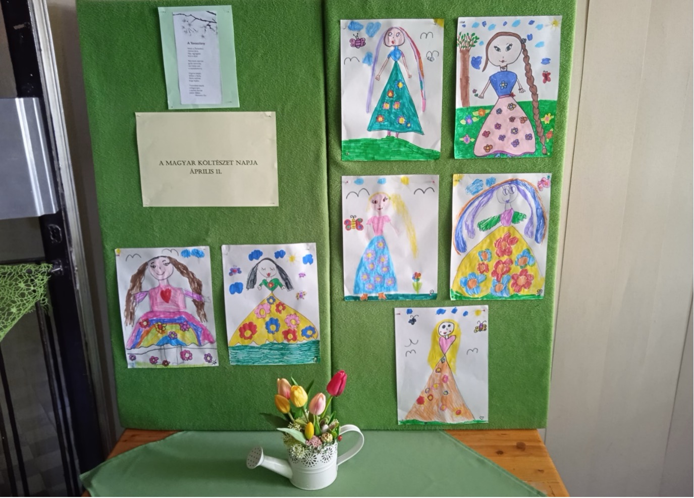 A Napsugár csoportból egy 6 éves kislány Mentovics Éva A Tavaszlány című verséről egy gyönyörű alkotást készített, amelyet a budapesti Erzsébetvárosi Kópévár Óvoda kezdeményezésére létrejövő - óvodások rajzaival illusztrált - Költészet napi antológiában fog megjelenni.