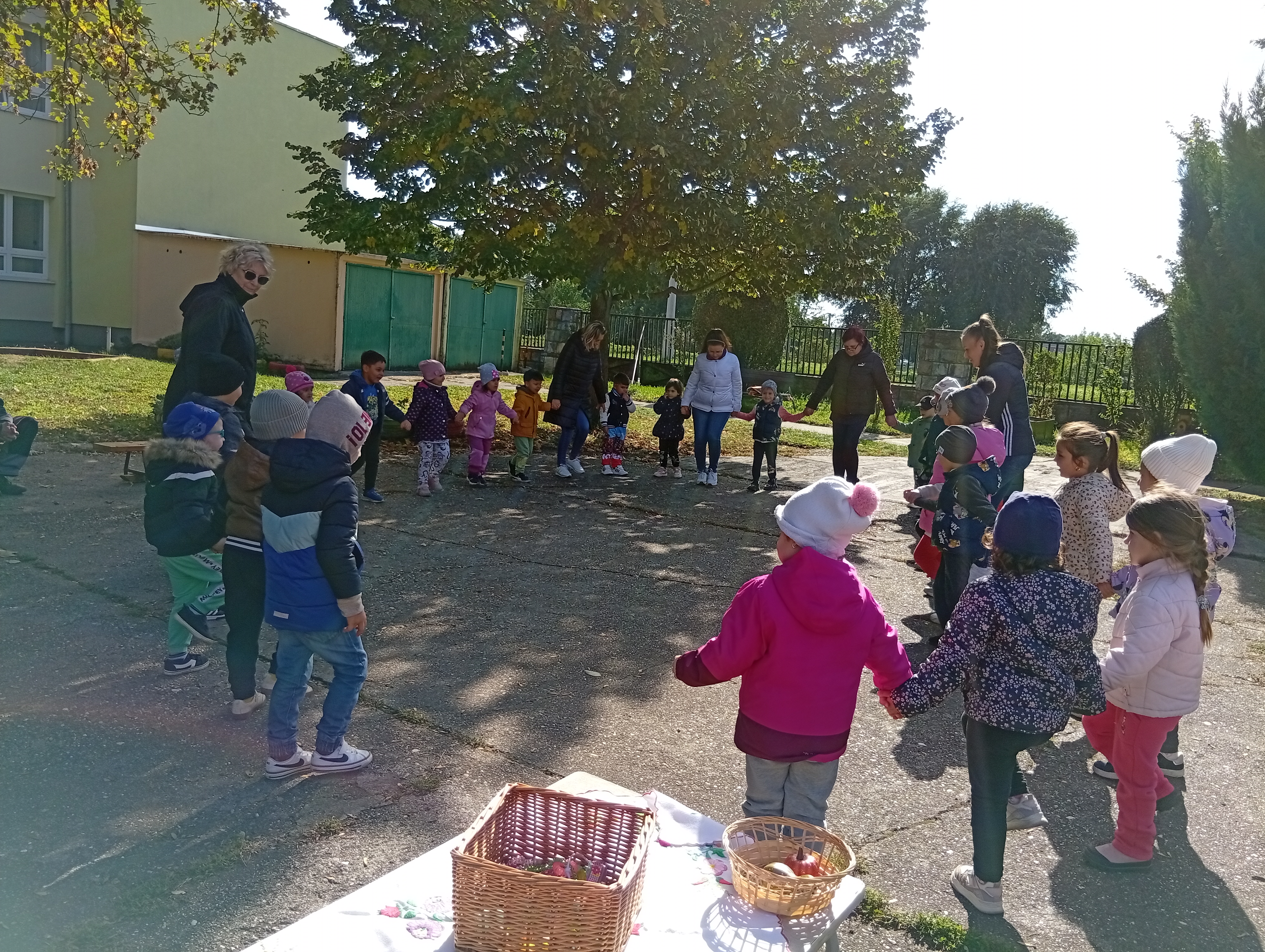 Az óvoda udvarán igazi vásári hangulatot teremtettünk: a színes standok, a népzene, a közös tánc mind hozzájárultak ahhoz, hogy a gyerekek átéljék a régi idők vásárainak hangulatát. A napot közös népi tánccal indítottuk, amely során mindenki együtt mozdult a zenére, megalapozva az esemény jókedvű, közösségi légkörét.