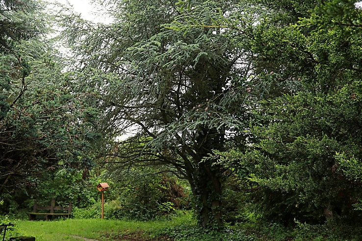 A családi örökséget is tovább víve, ápolva ez a szívügyünk, mi is nagyon szeretünk ide kijárni, bár nem tagadjuk, hogy sok a munka, főleg tavasszal, akár egy fakivágás, ami elkerülhetetlen egy elszáradás után, ez kemény munka. Érződött a tujavész, de nemcsak ez, igazándiból azért hívják tujavésznek, mert az emberek többségének kertjében tuja van, de ez már a nyitvatermők nagy részére is igaz: a fenyőfélék, az álciprusok nagyon rosszul bírják a hőséget, már az előző években is észleltünk a tűelhalást, ezért a foltokban való szárazodás látható a fákon. Amikor egy fa alulról kopaszodik, az teljesen normális, ha a teteje ép és egészséges. Ez a fenyőerdőkben is egy általános jelenség, viszont amikor már foltokban történik, amit itt is észrevehetünk ennél az álciprusnál itt mellettünk, ez már nem egészséges. A látogatók is úgy jönnek hozzánk, hogy kérdezik: Mit tegyenek, ha kiszáradt a tujájuk? Mondjuk nekik, sajnos nem sok mindent lehet tenni, öntözni kellett, viszont itt sajnos a fenyőkertben öntözőrendszer nincs kiépítve, csak vezetékes vizünk van, amivel egy ekkora területen a 30 éves fákat lehetetlen ellátni. Ráadásul a vízdíj is az alapítványunkat terheli, így nem vagyunk könnyű helyzetben. Most idén a májusi esős időszak nagy segítséget jelentett, látszik is a fákon, hálistennek megélénkültek, regenerálódtak. Jönnek rajtuk a legtöbb helyen az új hajtások. Igen szép állapotban van egyébként a fenyőkert a tavalyi őszhöz képest.