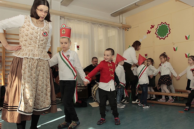 „Nem olyan könnyű egy 3-7 éves gyerekhez közelebb hozni az ünnepséget, de mi megpróbáljuk” – kezdte Ági néni, majd kifejtette, hogy kézműves foglalkozások során nemzeti színű kokárdákat készítettek és csákókat hajtogattak. Új, 1848-49-hez kapcsolódó kifejezéseket – mint a huszár – tanultak játékos és mesés formában. Ismerkedtek Petőfi Sándor és Kossuth Lajos nevével, továbbá verseket és dalokat tanultak.