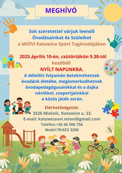 Sok szeretettel várjuk leendő Óvodásainkat és Szüleiket a MIÓVI Katowice Sport Tagóvodájában 2025.április 10-én, csütörtökön 9.30-tól kezdődő NYÍLT NAPUNKRA.