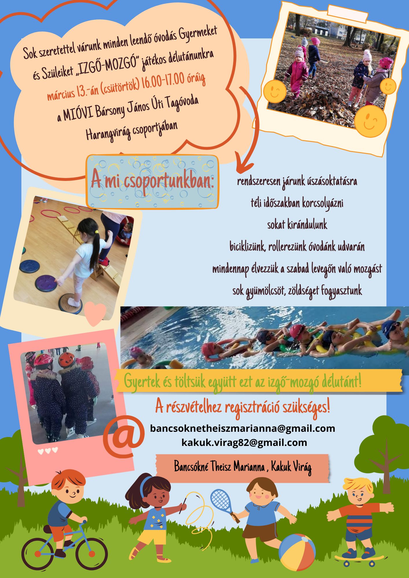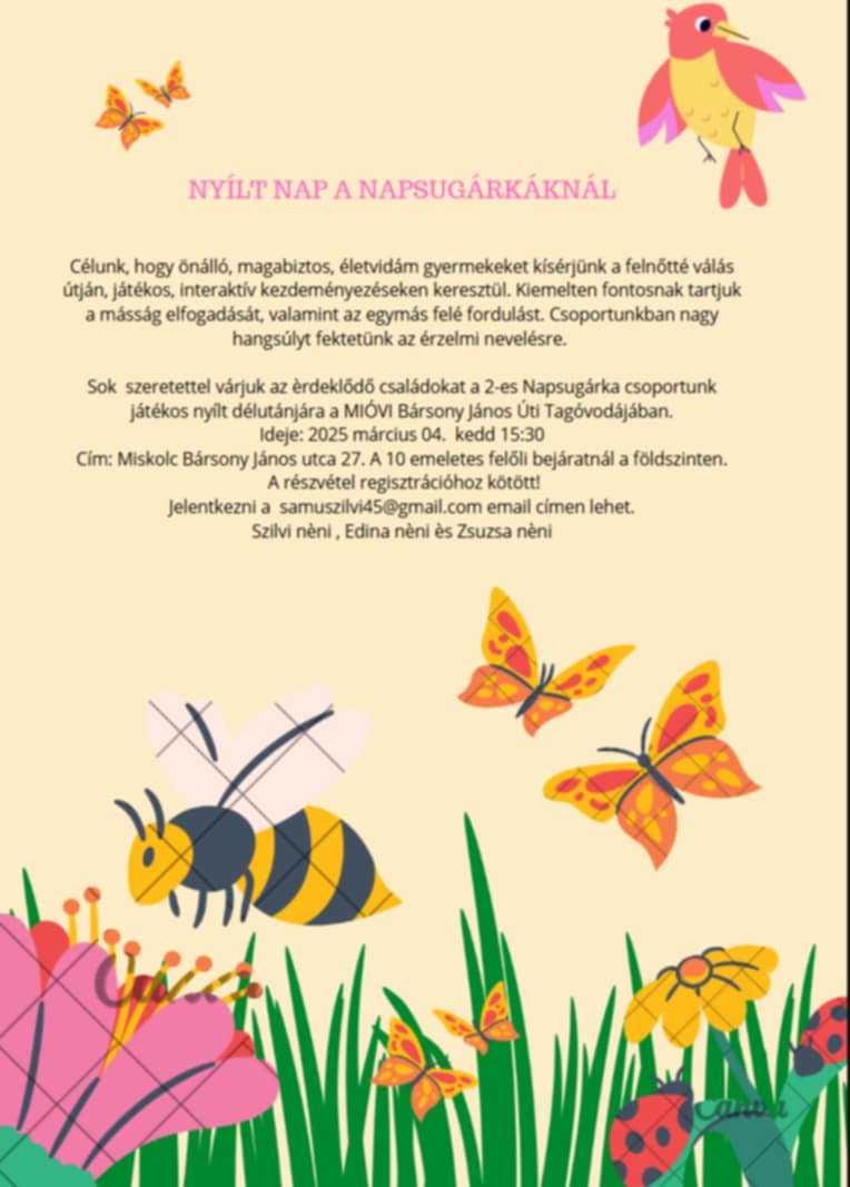 A MIÓVI Bársony János Úti Tagóvodájába nyílt délutánra várjuk a leendő Óvodásainkat és Szüleiket 2025. április 9-én 16-17 óráig az 1-es, ének-zene-tánc csoportba.