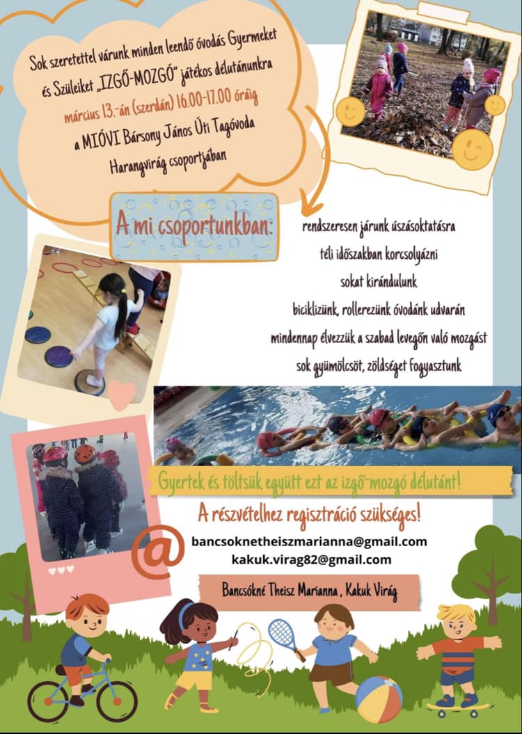 2024. február 26., hétfő MIÓVI Bársony János Úti Tagóvodája 2024. március 13.-án (szerda) 16:00-17:00. Részletek a mellékelt plakáton. Galéria