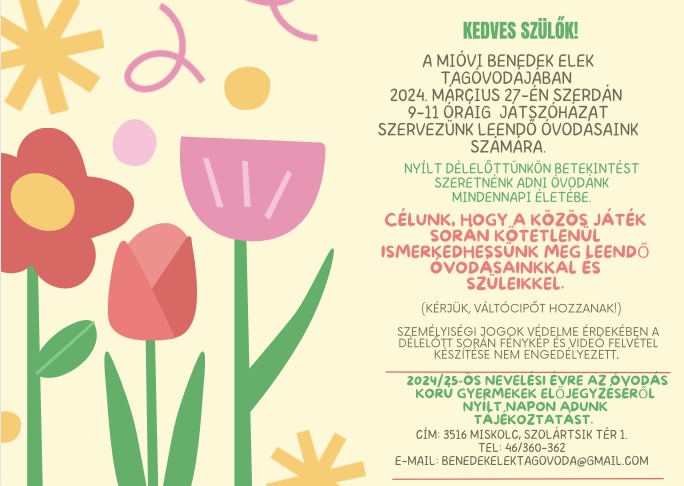 2024. március 6., szerda MIÓVI Benedek Elek Tagóvodája Időpontja: 2024. március 27. 09:00-11:00 Részletek a mellékelt plakáton. Galéria
