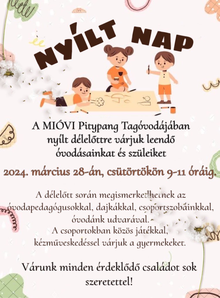 2024. március 19., kedd MIÓVI Pitypang Sport Tagóvodája A MIÓVI Pitypang Tagóvodájában nyílt délelőttre várjuk leendő óvodásainkat és szüleiket 2024. március 28-án, csütörtökön 9-11 óráig. Részletek a mellékelt plakáton. Galéria