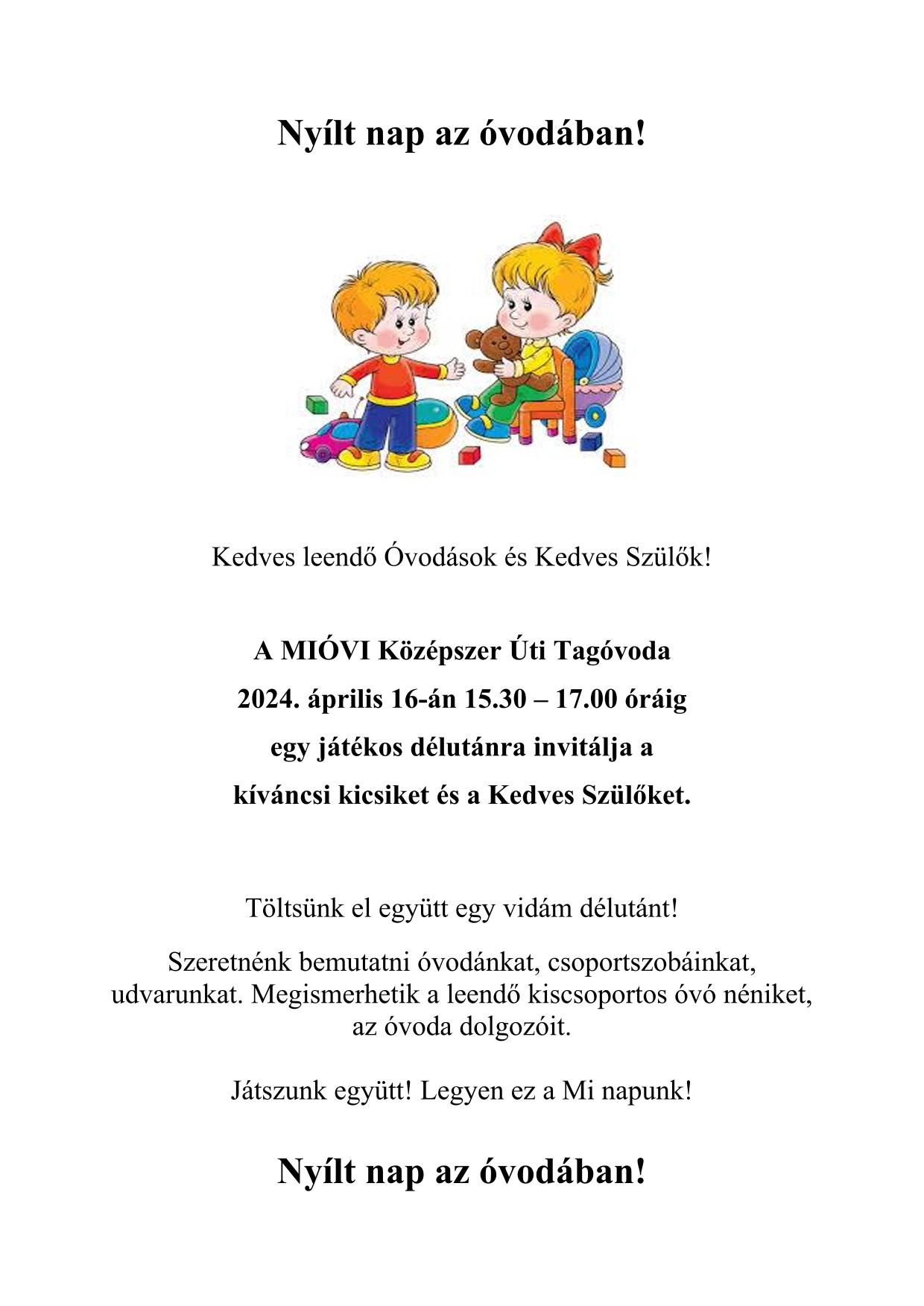2024. március 13., szerda MIÓVI Középszer Úti Tagóvodája A MIÓVI Középszer Úti Tagóvodája 2024. április 16-án 15:30 - 17:00 óráig egy játékos délutánra invitálja a kicsiket és a Kedves Szülőket. Galéria