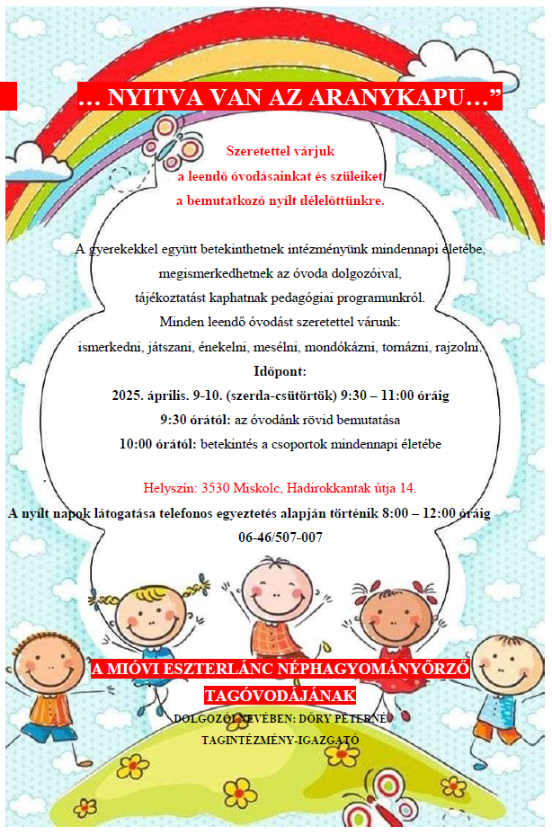 A nyílt napok látogatása telefonos egyeztetés alapján történik 8:00 – 12:00 óráig