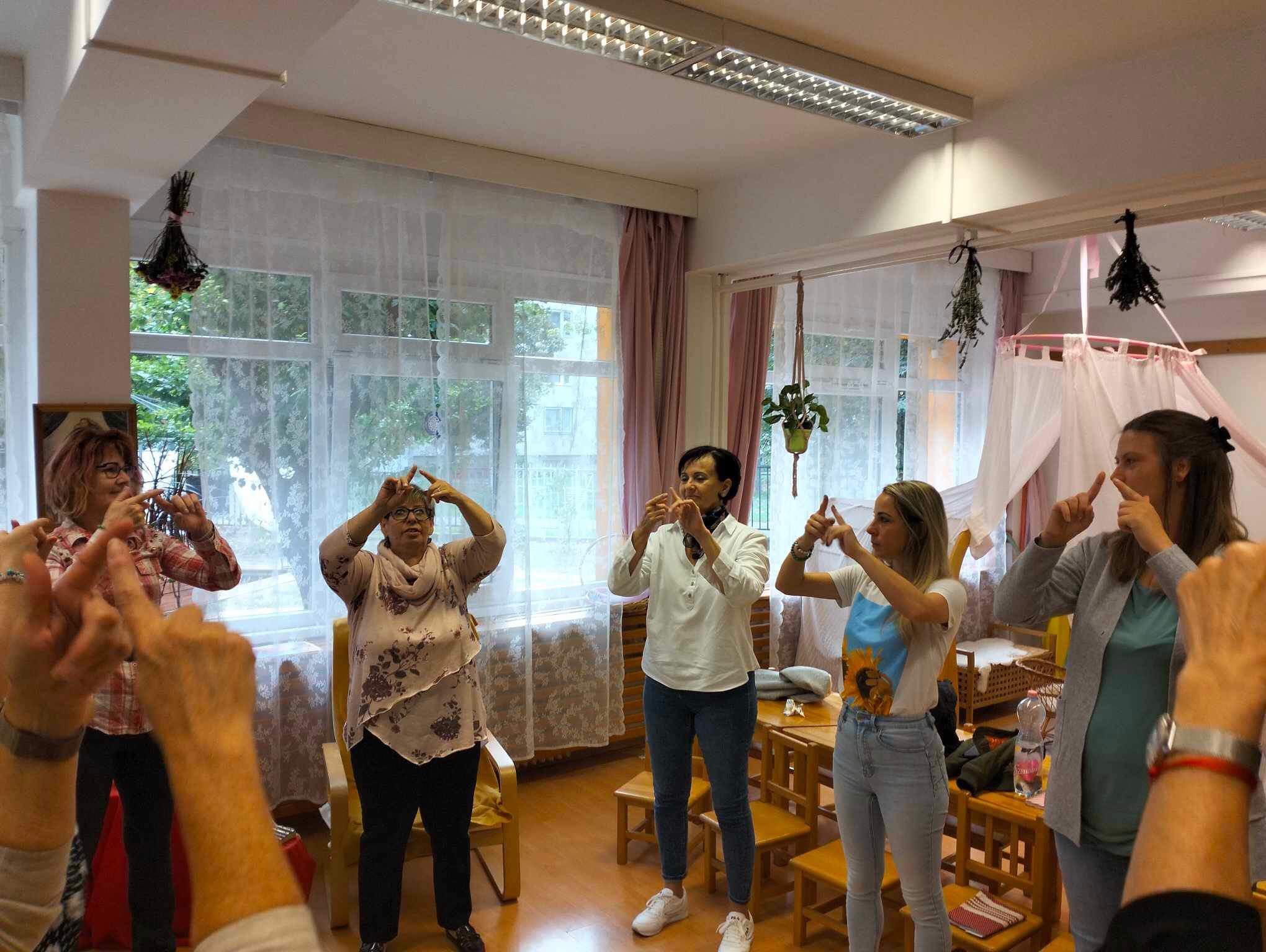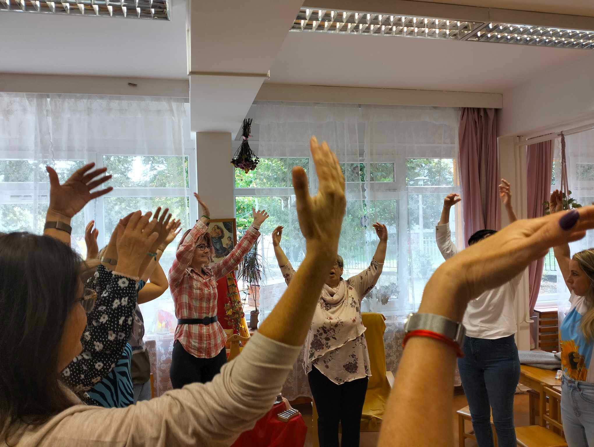 A műhelybeszélgetés során a jelenlevő óvodapedagógusok részt vehettek egy Ritmikus Körjátékban, és így élhettünk meg együtt azt az örömöt, amit a ritmus, a beszéd, és a mozgás együttesével élnek át minden nap az óvodás gyerekek. Megtapasztalhatták, hogyan lehet egy mesei elemekkel átszőtt tevékenységben komplex módon megismertetni a gyerekeket az őket körülvevő környezet természeti változásaival, változatos mozgásformákkal, dalokkal, versekkel, melyek erősítik a közösségi kapcsolataikat.
