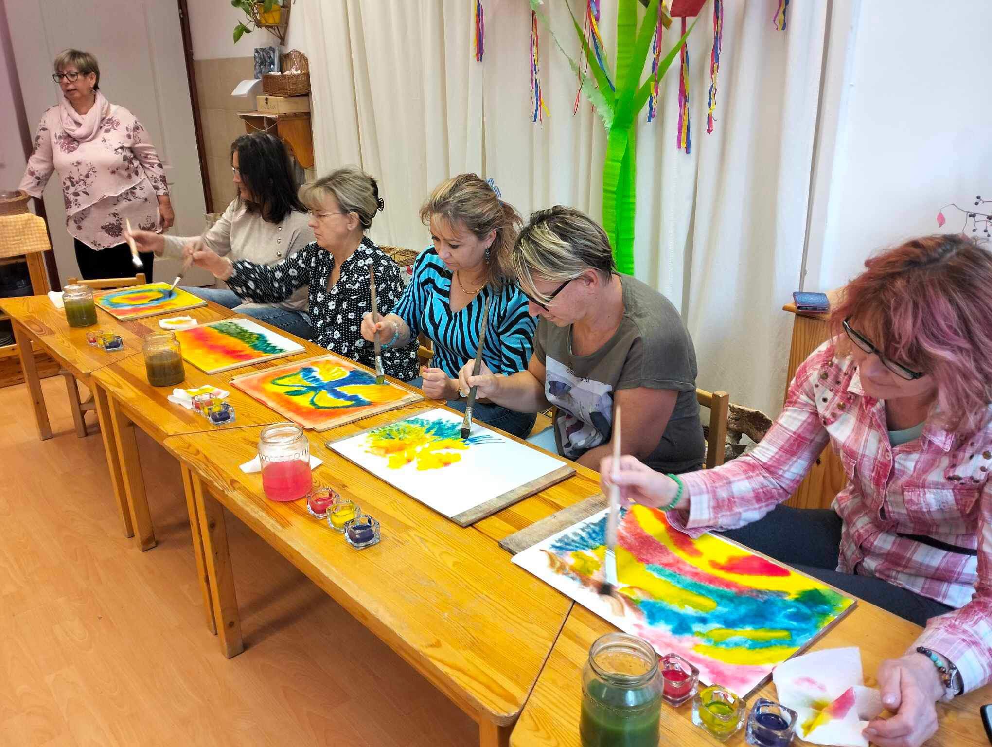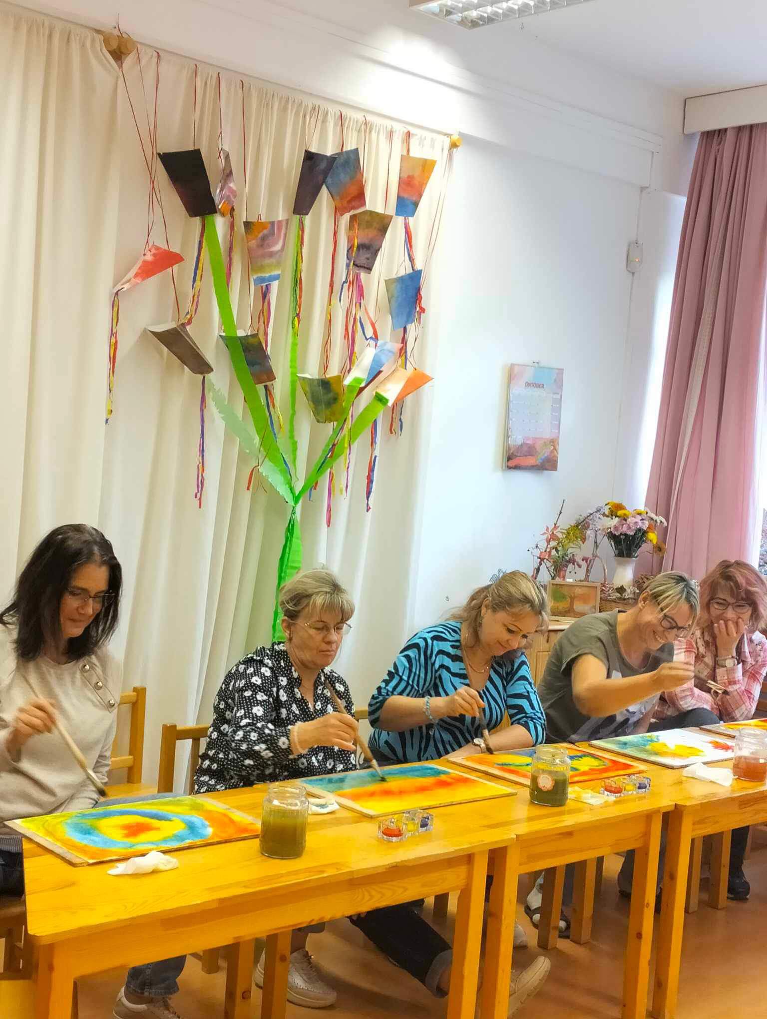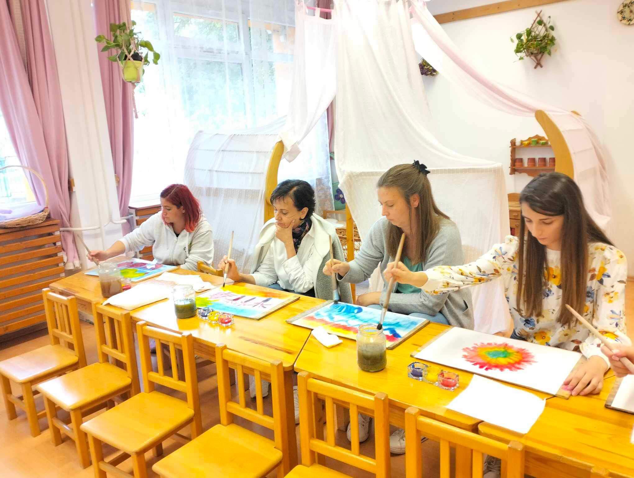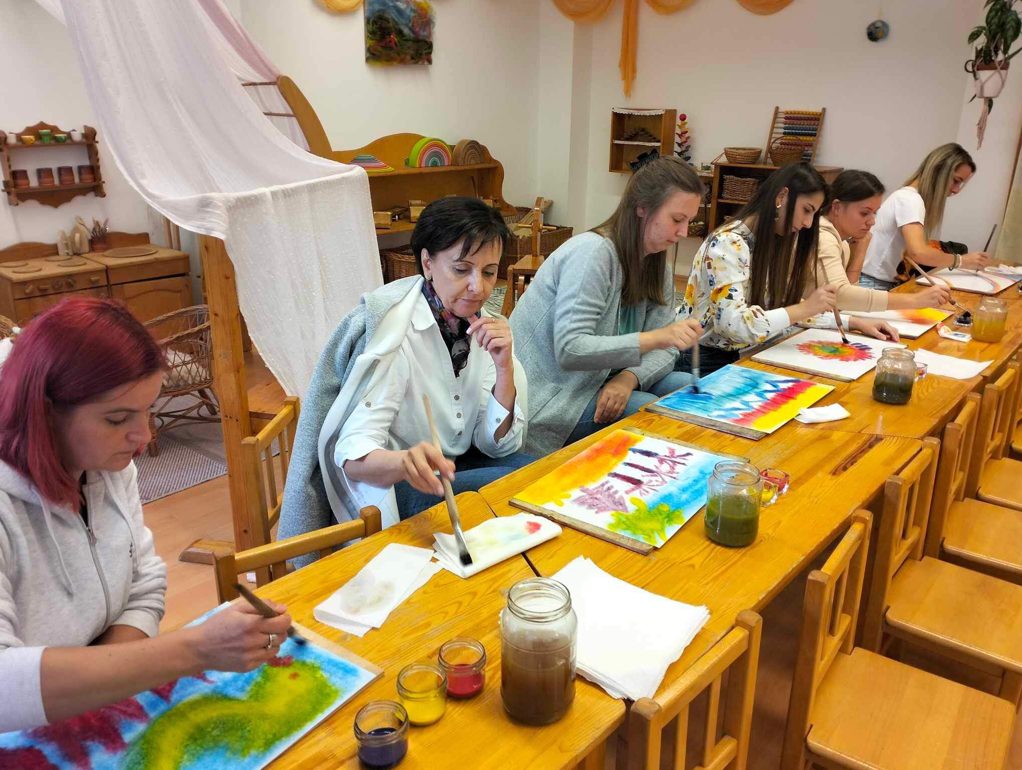 Megtapasztalhatták azt is az érdeklődő kollégák, hogy milyen érzés és élmény három színből képet festeni, vezetni, vagy terelgetni a színek keveredését, formákat kialakítani. Hogyan tud például egy gyermek egy festés során felfedezni összefüggéseket, miközben rácsodálkozik arra.