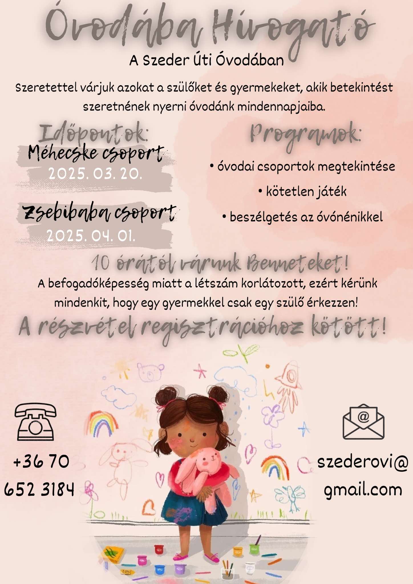 A befogadóképesség miatt a létszám korlátozott, ezért kérünk mindenkit, hogy egy gyermekkel csak egy szülő érkezzen!
