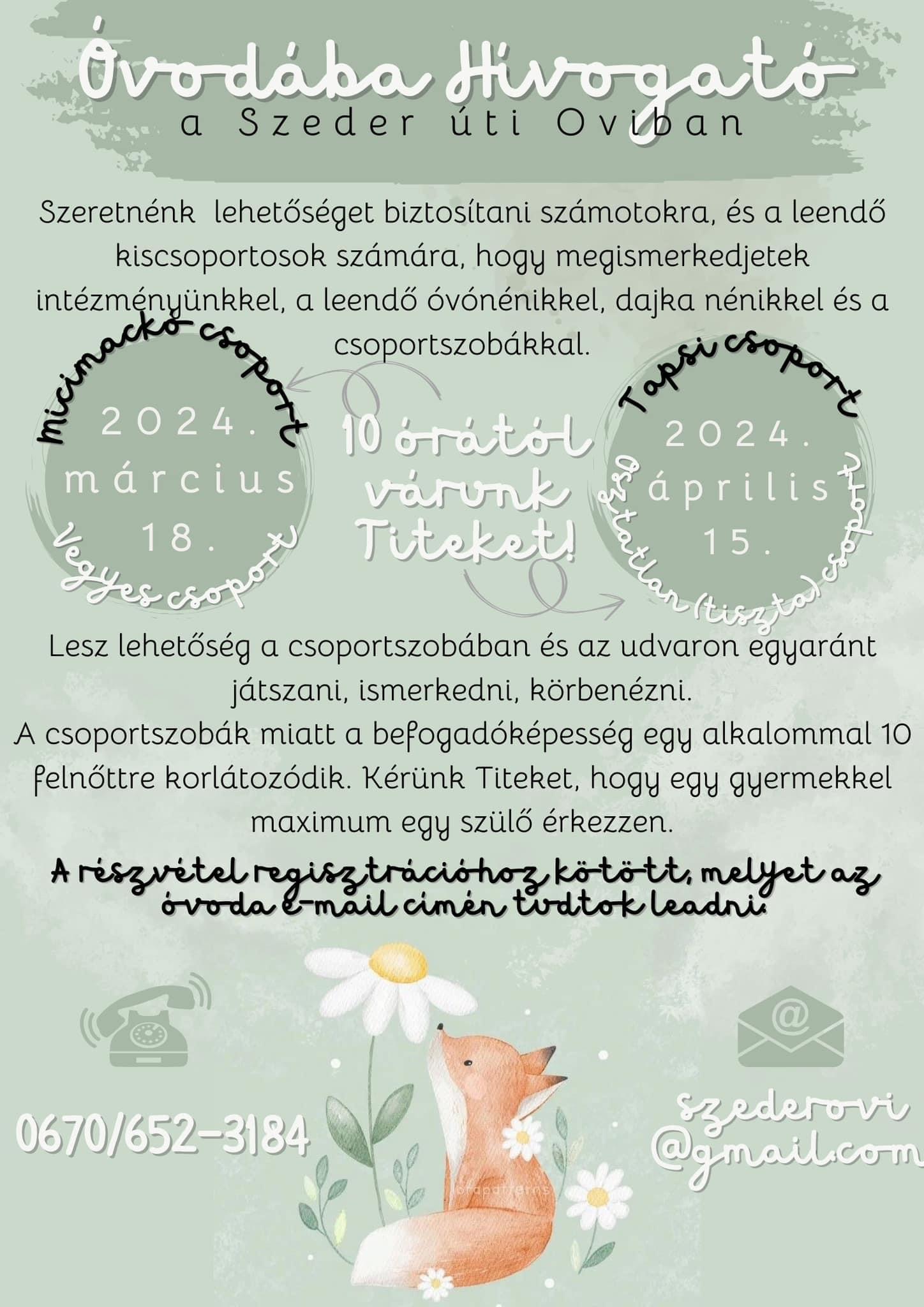 2024. február 22., csütörtök MIÓVI Szeder Úti Tagóvodája A Szeder úti Tagóvoda Március 18 és április 15-ei dátummal 10 órai kezdéssel “Óvodába hívogató” nyíltnapot hirdet. Galéria