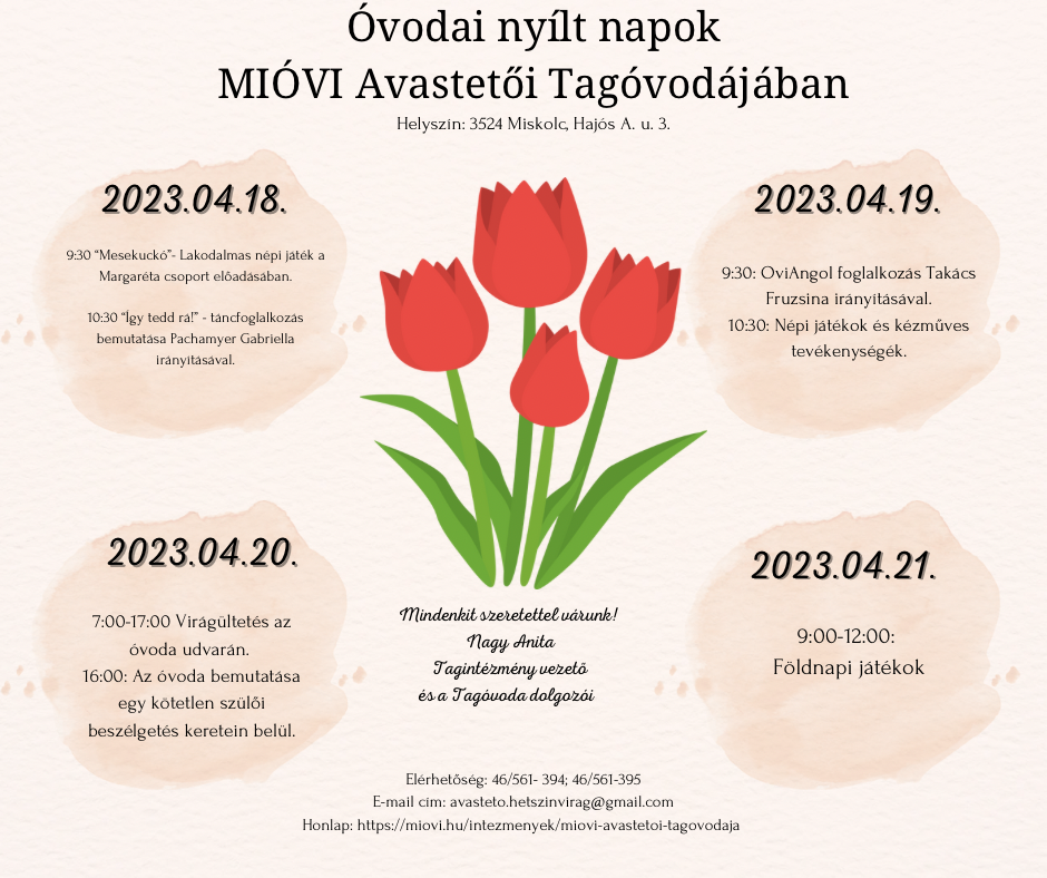 - 16:00 Az óvoda bemutatása egy kötetlen szülői beszélgetés keretein belül.