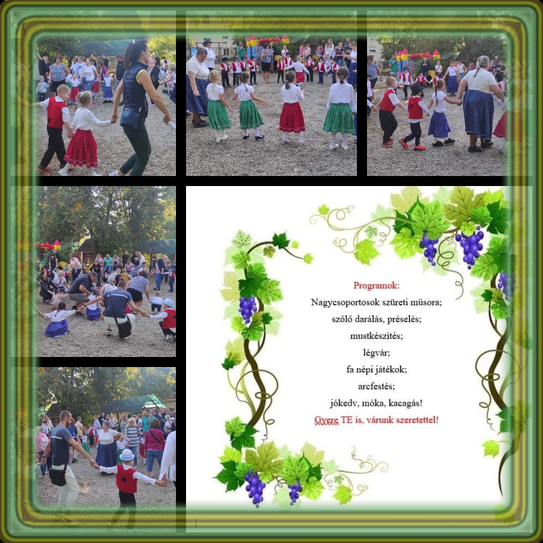 Az óvodásoknak és természetesen a szülőknek lehetőségük volt kipróbálni a szőlő darálást, préselést. Mustot és hamuba sült pogácsát fogyasztottunk, népi ügyességi játékokokkal, arcfestéssel és ugrálóvárral fokoztuk a hangulatot.